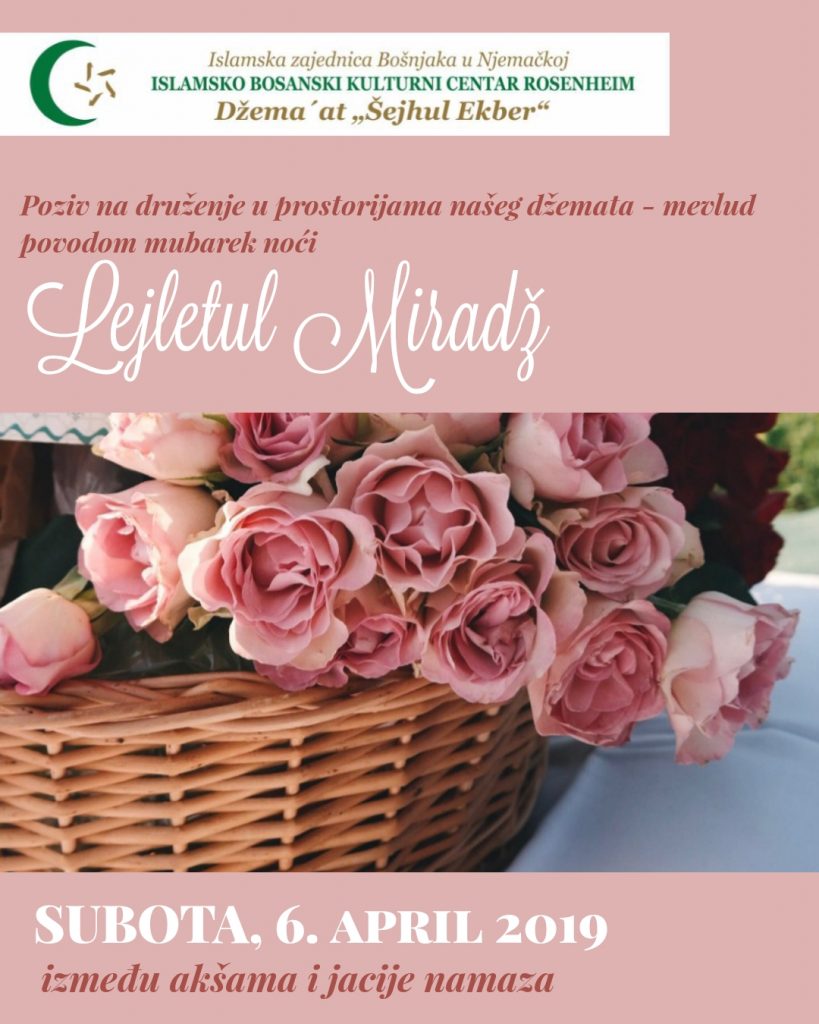 Poziv na druženje u prostorijama našeg džemata i mevlud povodom mubarek noci „Lejletul Miradž“ izmedžu akšama i jacije namaza. Subota